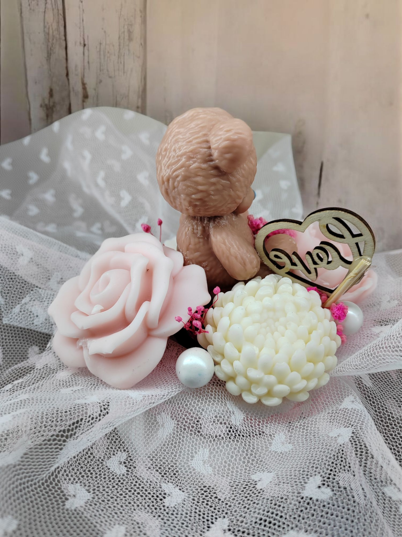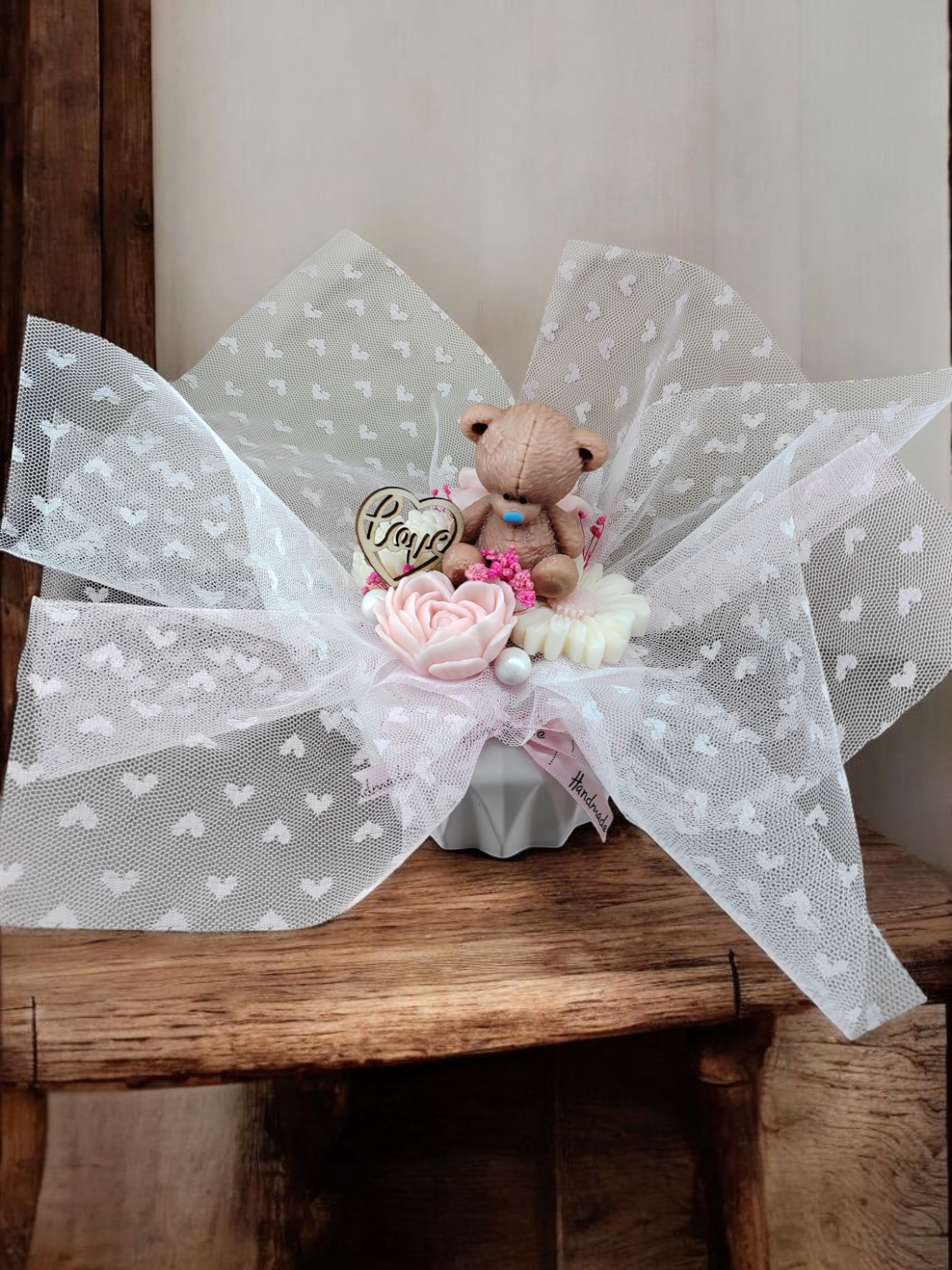 Bouquet de fondants parfumés blanc et rose pâle avec son ourson Me too You senteur Love Spell inspiration de Victoria Secret.