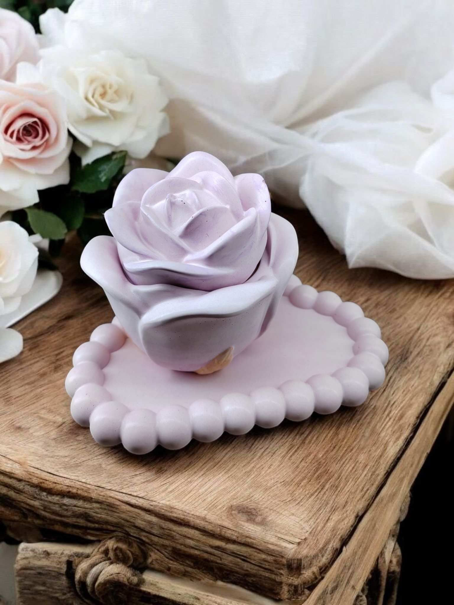 Dans un magnifique pot en forme de Rose. Vendu avec sa soucoupe. L'ensemble entièrement fabriqué dans notre atelier.
