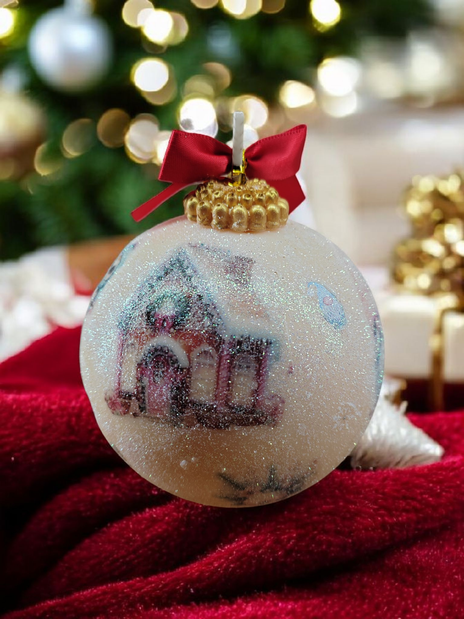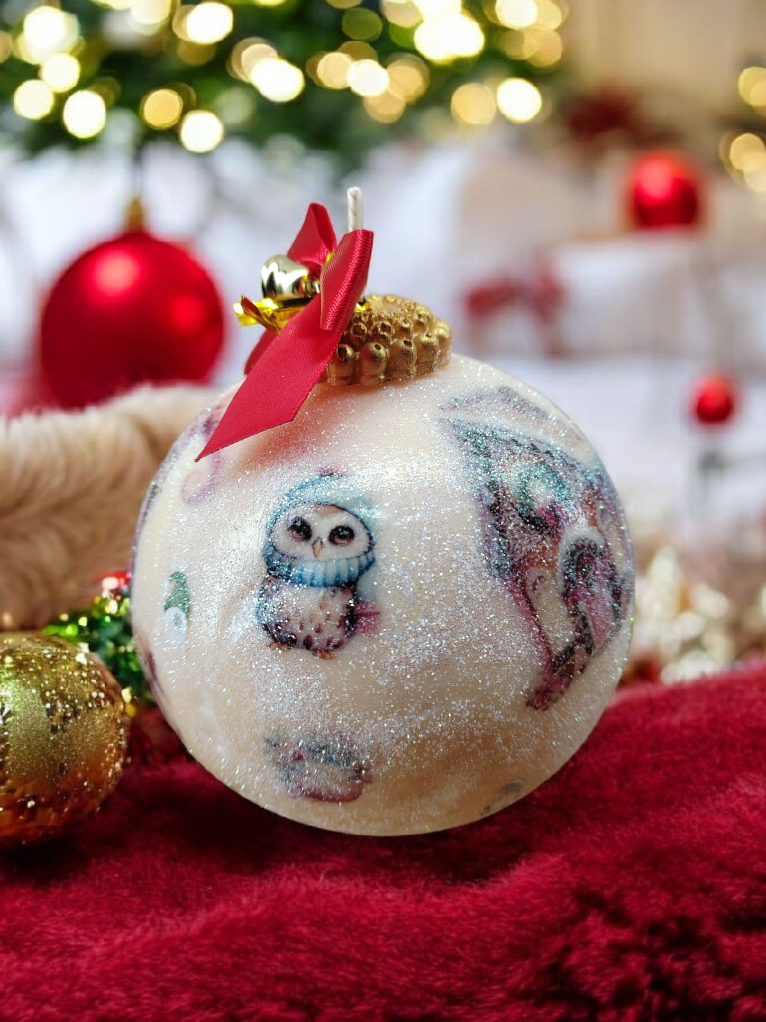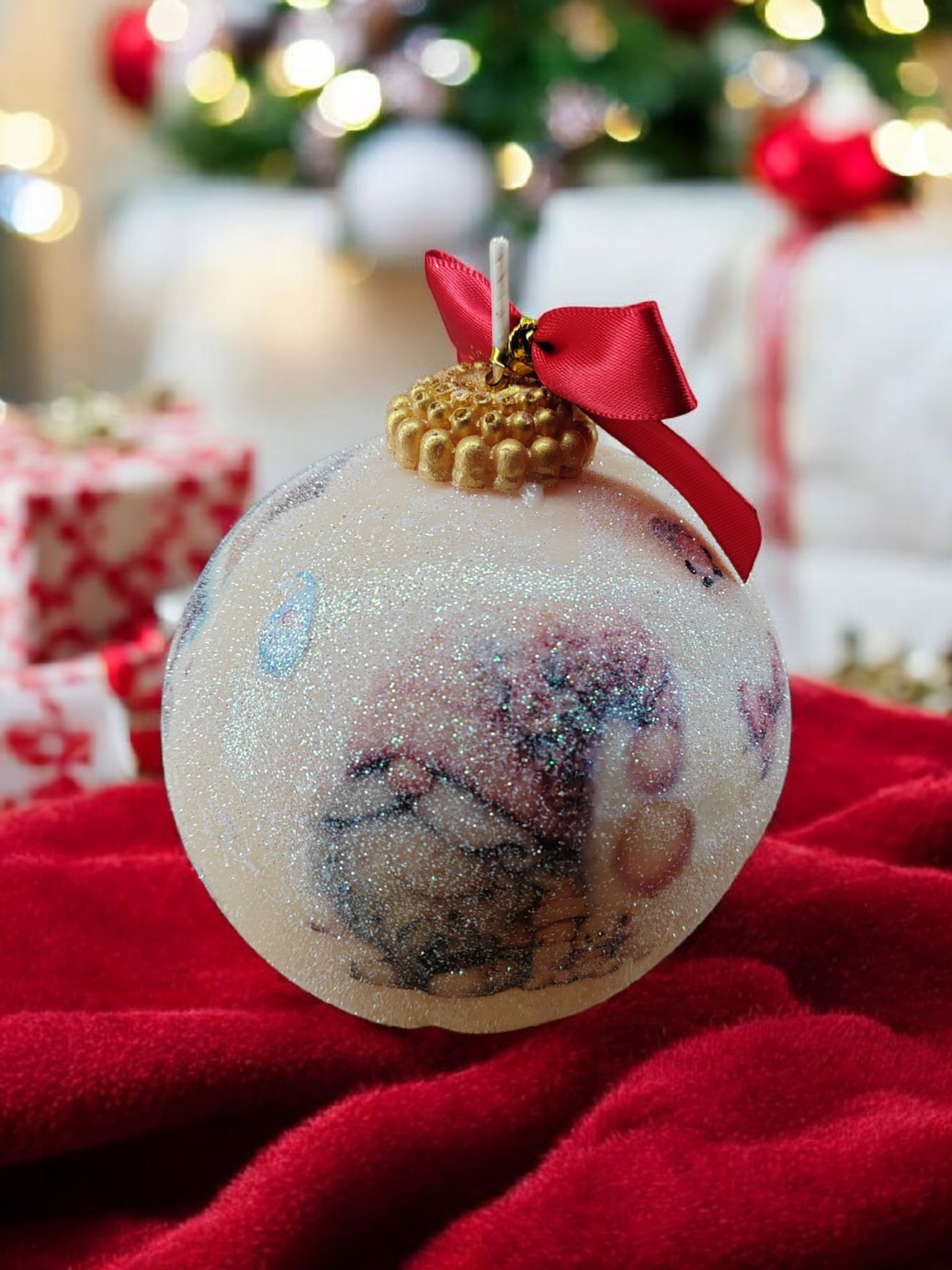 Faites entrer la magie des fêtes dans votre intérieur avec cette bougie en forme de boule de Noël, entièrement réalisée à la main dans mon atelier.
