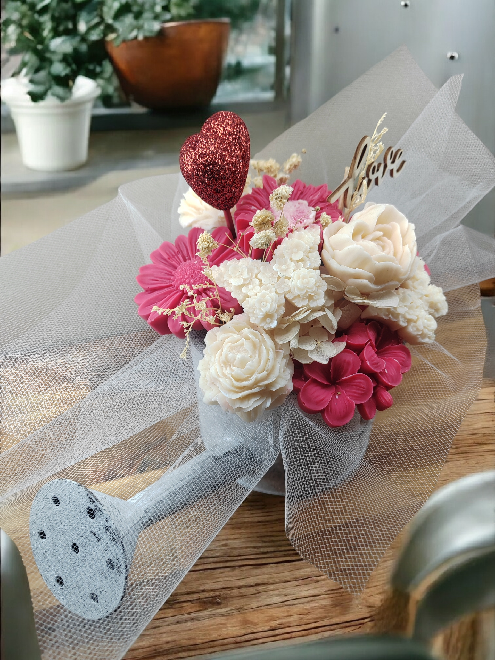 Retrouvez notre toute dernière création spéciale St Valentin ! Une composition florale parfumée senteur Cerise Noire Explosive. Composition réalisée dans un magnifique pot en forme d'arrosoir "Jardin aux oiseaux" réutilisable.